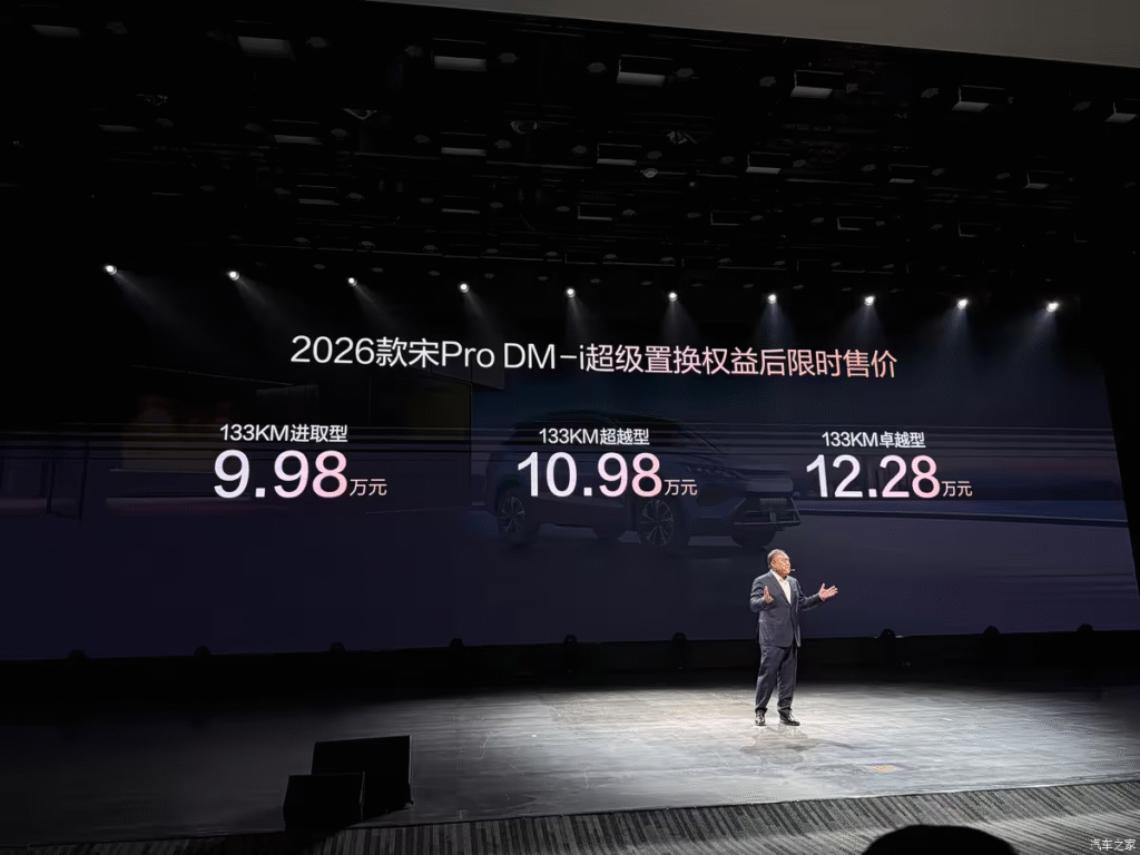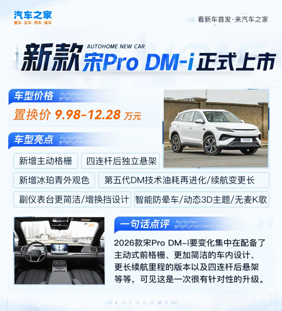 BYD has just launched the 2026 Song Pro DM-i, a major update to its flagship model in the new energy compact SUV market. The new vehicle is available in three trim levels, with an official price range of 102,800 to 125,800 RMB. For a limited time, a “Super Trade-in” subsidy drops the price to an aggressive 99,800 to 122,800 RMB.