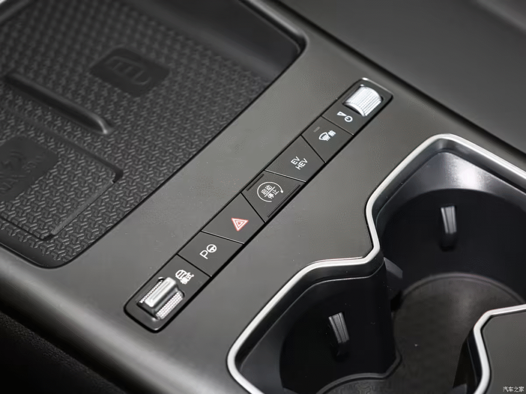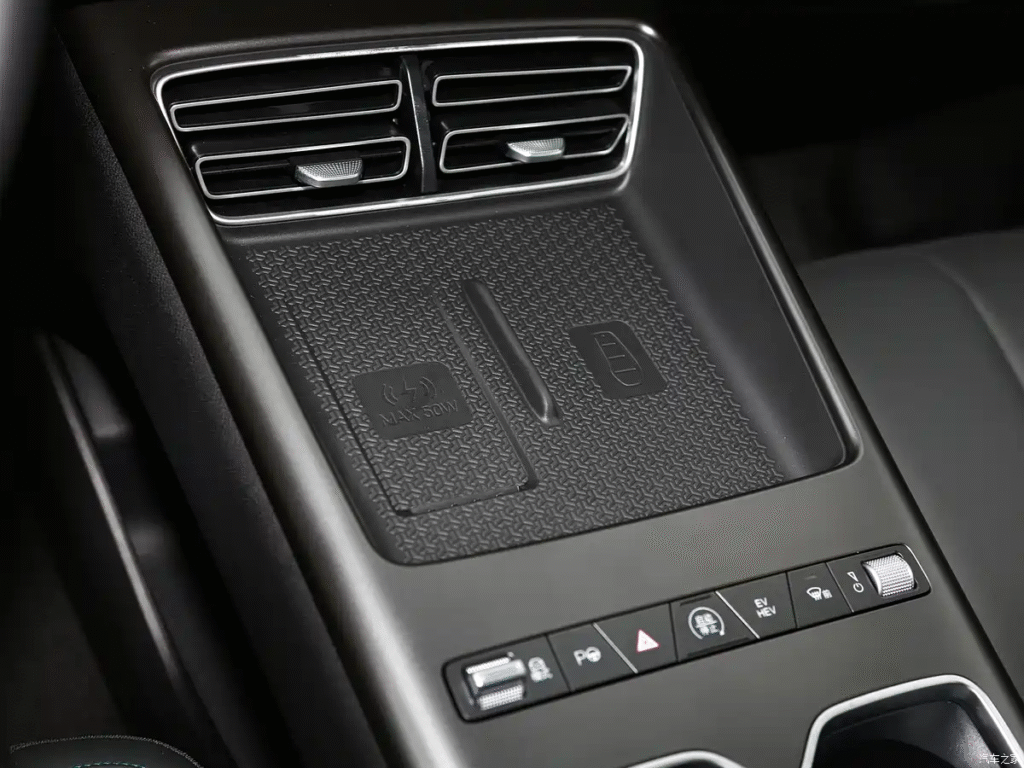 The biggest change is the redesigned center console. The 2026 model uses a new column-mounted gear selector. This change frees up significant space. Below the air vents, there is now a 50W wireless phone charging pad. Behind it, a simplified row of high-frequency physical buttons remains for key functions like drive mode, auto-park, EV/HEV toggle, and front windshield defrost.