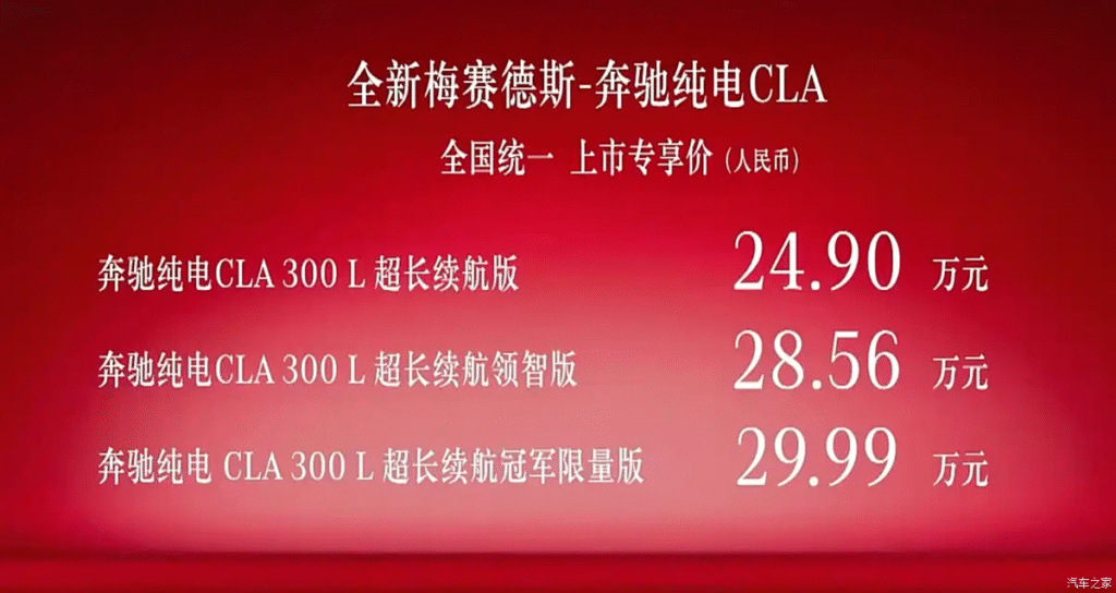 On November 3rd, the all-new Mercedes-Benz pure electric long-wheelbase (LWB) CLA officially launched. The new lineup includes three configurations, with an official price range of 249,000 to 299,900 RMB. This starting price is 10,000 RMB lower than the previously announced pre-sale price, making it a very aggressive competitor.
