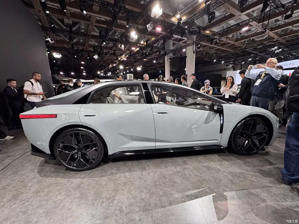From the side, the design remains sleek. The roof is a single, massive panoramic glass panel. The side mirrors are slender, and the design hints at the possibility of frameless doors. The door handles are a semi-hidden design, preserving the smooth body lines, and the car sits on a set of large-diameter wheels.